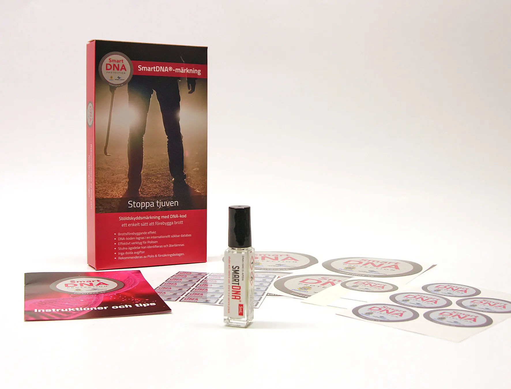 SmartDNA® är marknadens ledande och godkända märkDNA. Varje DNA-kit har en unik dna kod för dig som kund. Vi erbjuder både märkDNA med pensel eller spray beroende på vad du ska märka. Vare sig du behöver skydda ditt lantbruk, företag, hemmet, båtmotor, cykel, bil, katalysator eller värdeföremål med märkDNA så har vi rätt produkt för dig. Alla våra SmartDNA® märkDNA produkter är certifierade och godkända enligt gällande försäkrings och myndighetskrav Norm 1098. Smart Protection ISR är också godkänt enligt Norm 1084. Vi har säkerhetslösningar för hemmet, säkerhetslösningar kontor, säkerhetslösningar för båt, cykel, motocykel och säkerhetslösningar för företag.